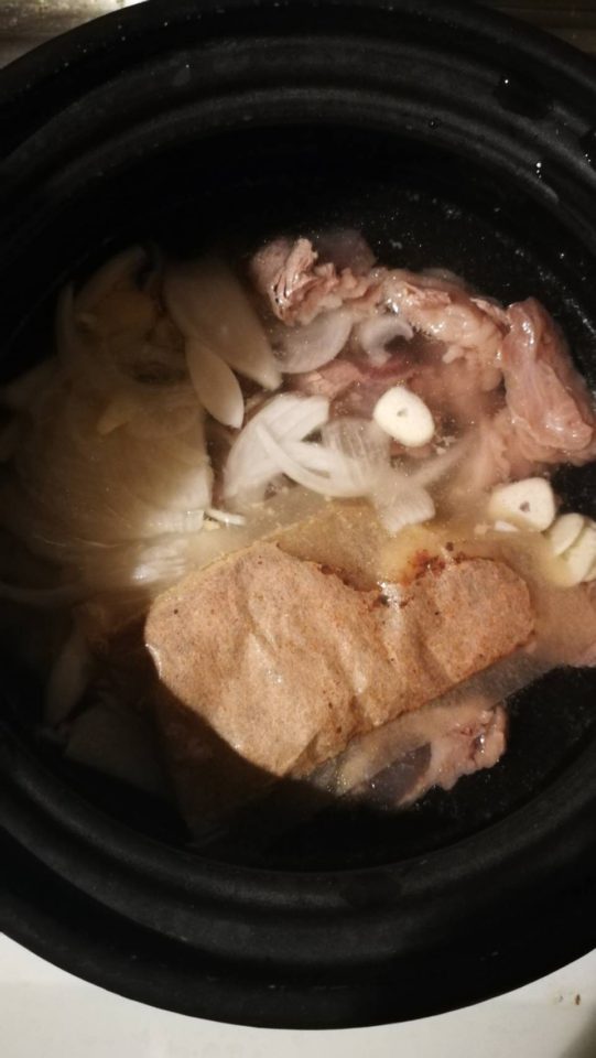 ①鍋にたっぷりのお湯を沸騰させ、牛スジを入れて15分茹でる。茹でている間にニンニク、玉ねぎをスライスしておく。