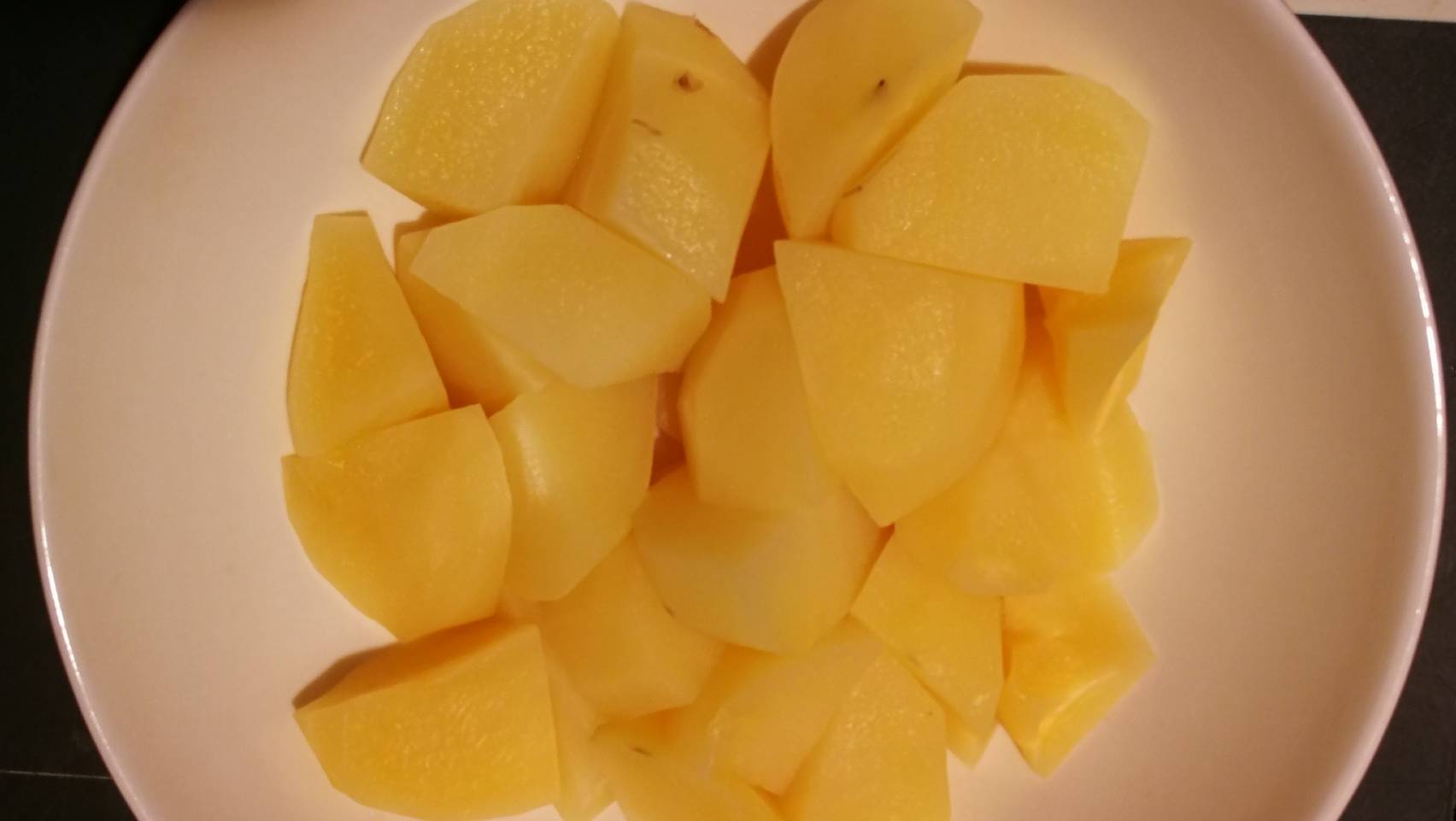 ①じゃがいもを適当な大きさに切り、耐熱皿に入れてふんわりとラップをかけて電子レンジで柔らかくなるまで加熱する。